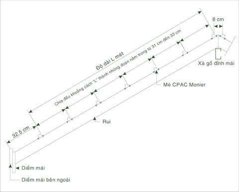 - Những khoảng cách con lại bạn nên chia đều: Đo chiều dài mét (L) của khoảng còn lại từ hàng mè đầu tiên cho đến hàng mè trên nóc mái, chia đều khoảng cách L thành các khoảng bằng nhau, các khoảng đó nằm trong tầm 31 -33 cm để đặt các hàng mè còn lại.