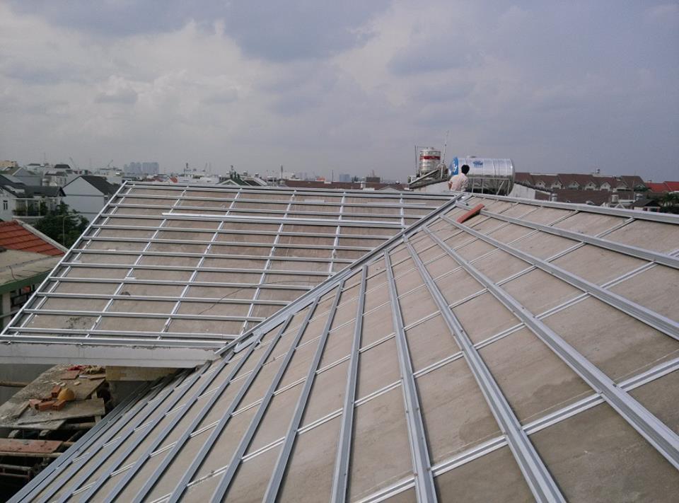 Khung kèo mái lợp tôn là một tổ hợp giữa các thanh TC75.75  và Mè TS 40.48 được chế tạo thành một vì kèo liên kết bằng vít tự khoan cường độ cao. Được định vị vào dầm bê tông bằng pad liên kết, Buloong nở hay Buloong đạn với kích thước M100x120mm hoặc M120x150mm.  Các vì kèo được liên kết với nhau bằng cánh giằng bụng.