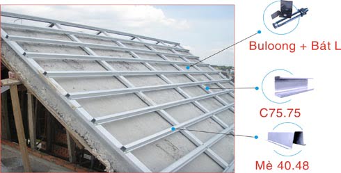 - Khung kèo mái lợp tôn là một tổ hợp giữa các thanh TC75.75 và Mè TS 40.48 được chế tạo thành một vì kèo liên kết bằng vít tự khoan cường độ cao. Được định vị vào dầm bê tông bằng pad liên kết, Buloong nở hay Buloong đạn với kích thước M100x120mm hoặc M120x150mm. Các vì kèo mái thái được liên kết với nhau bằng cánh giằng bụng