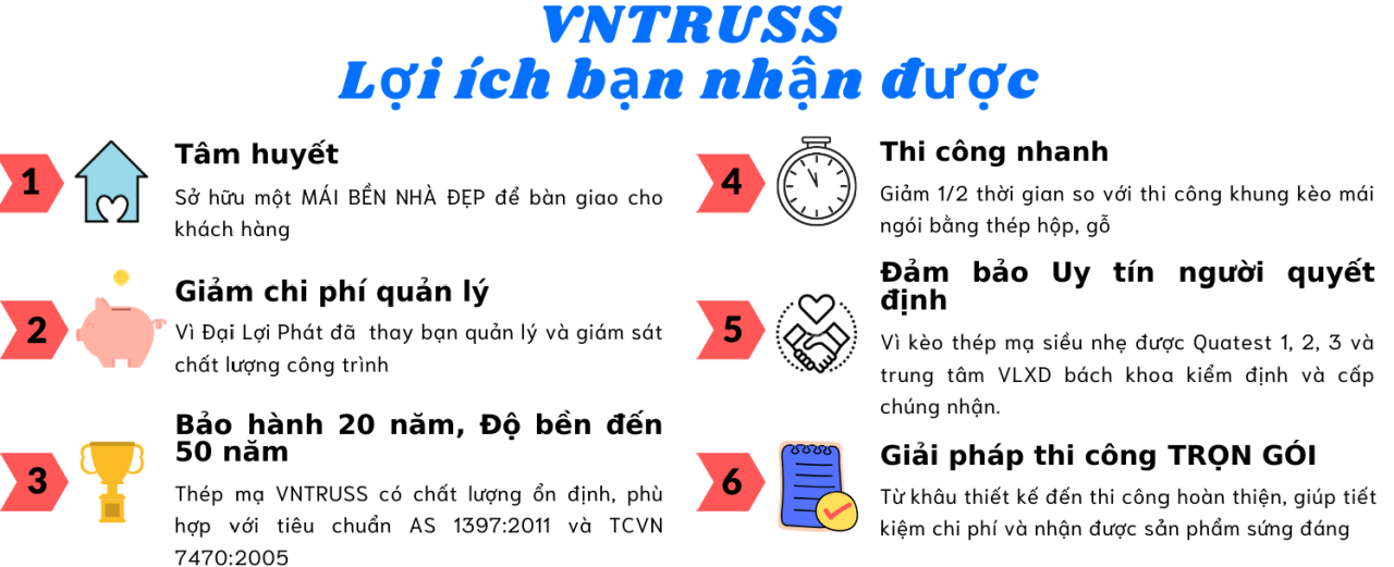 - Vì kèo mái ngói VNTRUSS là sản phẩm của công ty CP Đại Lợi Phát, được làm từ thép mạ hợp kim nhôm kẽm cường độ cao. Được Quý khách hàng tin dùng bởi lớp mạ hợp kim nhôm kẽm dày từ 100 – 150 g/m2 và độ cứng G550 MPA
